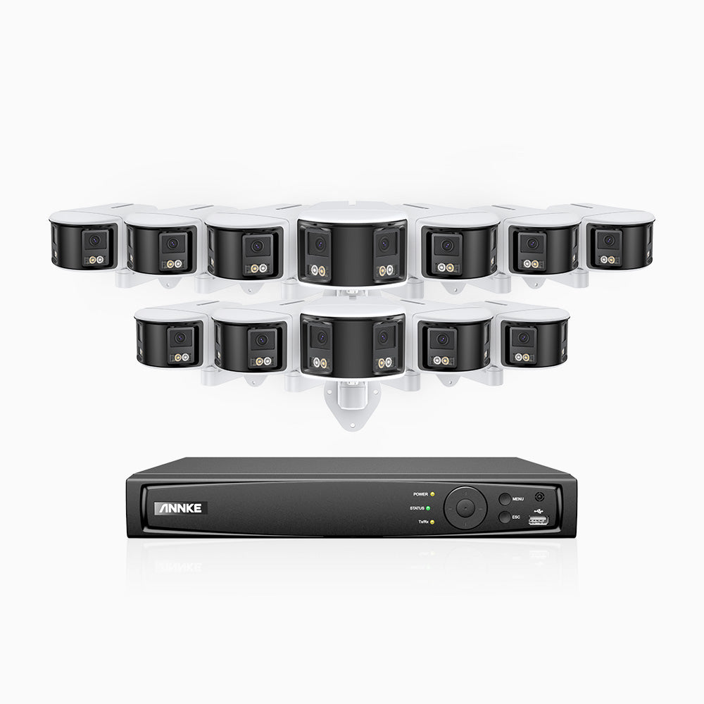 FDH600 - Kit de surveillance PoE 6MP à 16 canaux avec 12 caméras, double objectif, ultra grand angle 180°, super ouverture f/1.2, micro intégré, sirène et alarme actives, Détection Intelligente de Mouvement