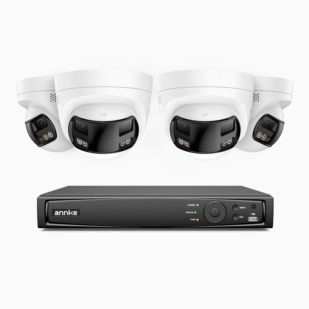 FDH800 - Kit de surveillance PoE 8MP à 8 canaux avec 4 caméras, double objectif, ultra grand angle 180°, vision nocturne intelligente à double éclairage, audio bidirectionnel, sirène et alarme actives, détection humaine et de véhicules, IP67
