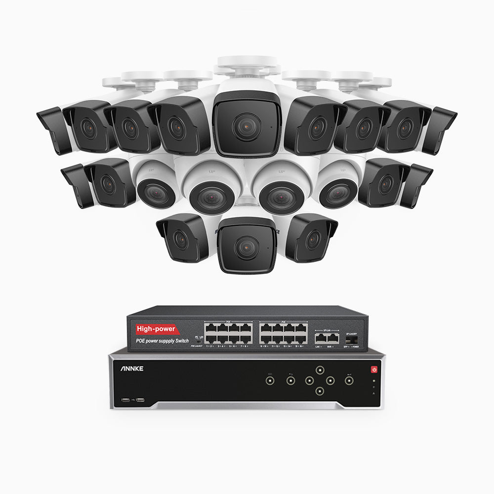H500 - Kit de surveillance PoE 5MP à 32 canaux avec 16 caméras bullet et 4 caméras tourelle, Vision nocturne Infrarouge 2.0, Microphone intégré, Fente pour carte SD, Fonctionne avec Alexa, Switch PoE 16 ports inclus