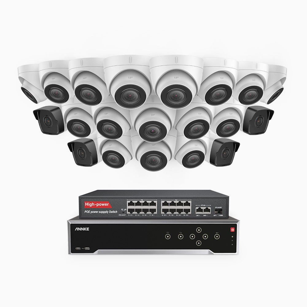 H500 - Kit de surveillance PoE 5MP à 32 canaux avec 4 caméras bullet et 16 caméras tourelle, Vision nocturne Infrarouge 2.0, Microphone intégré, Fente pour carte SD, Fonctionne avec Alexa, Switch PoE 16 ports inclus