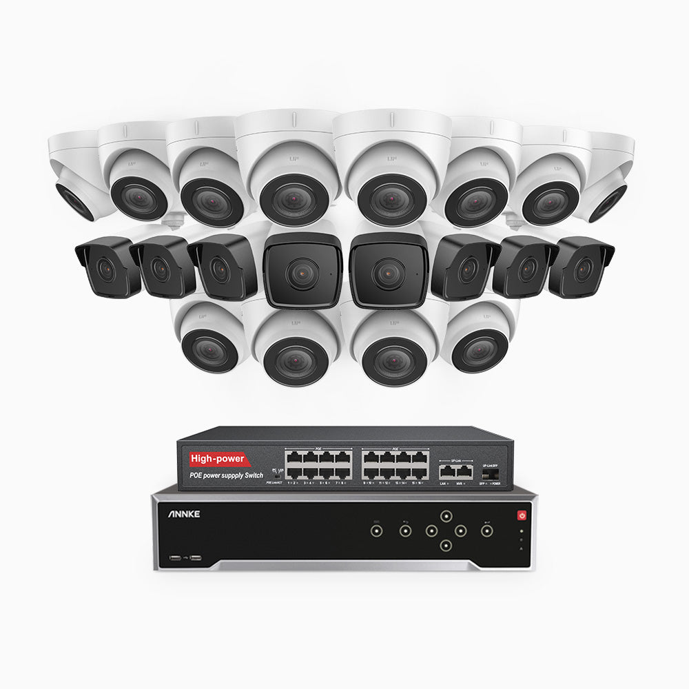 H500 - Kit de surveillance PoE 5MP à 32 canaux avec 8 caméras bullet et 12 caméras tourelle, Vision nocturne Infrarouge 2.0, Microphone intégré, Fente pour carte SD, Fonctionne avec Alexa, Switch PoE 16 ports inclus