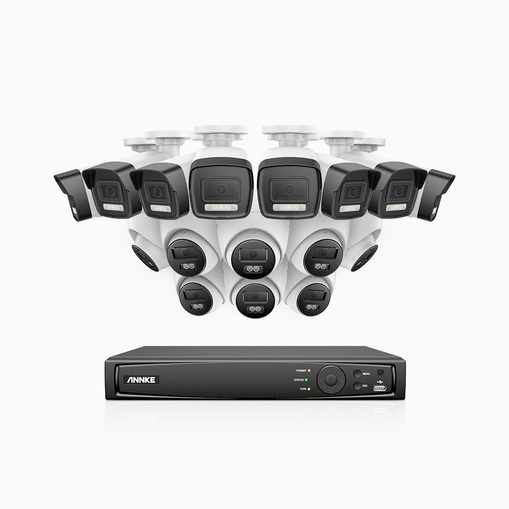H500P - Kit de surveillance PoE 3K à 16 canaux avec 8 caméras bullet et 8 caméras tourelle, vision nocturne en couleur et infrarouge, résolution 3072*1728, ouverture f/1.6 (0.005 Lux), détection humaine et véhicule, microphone intégré, IP67
