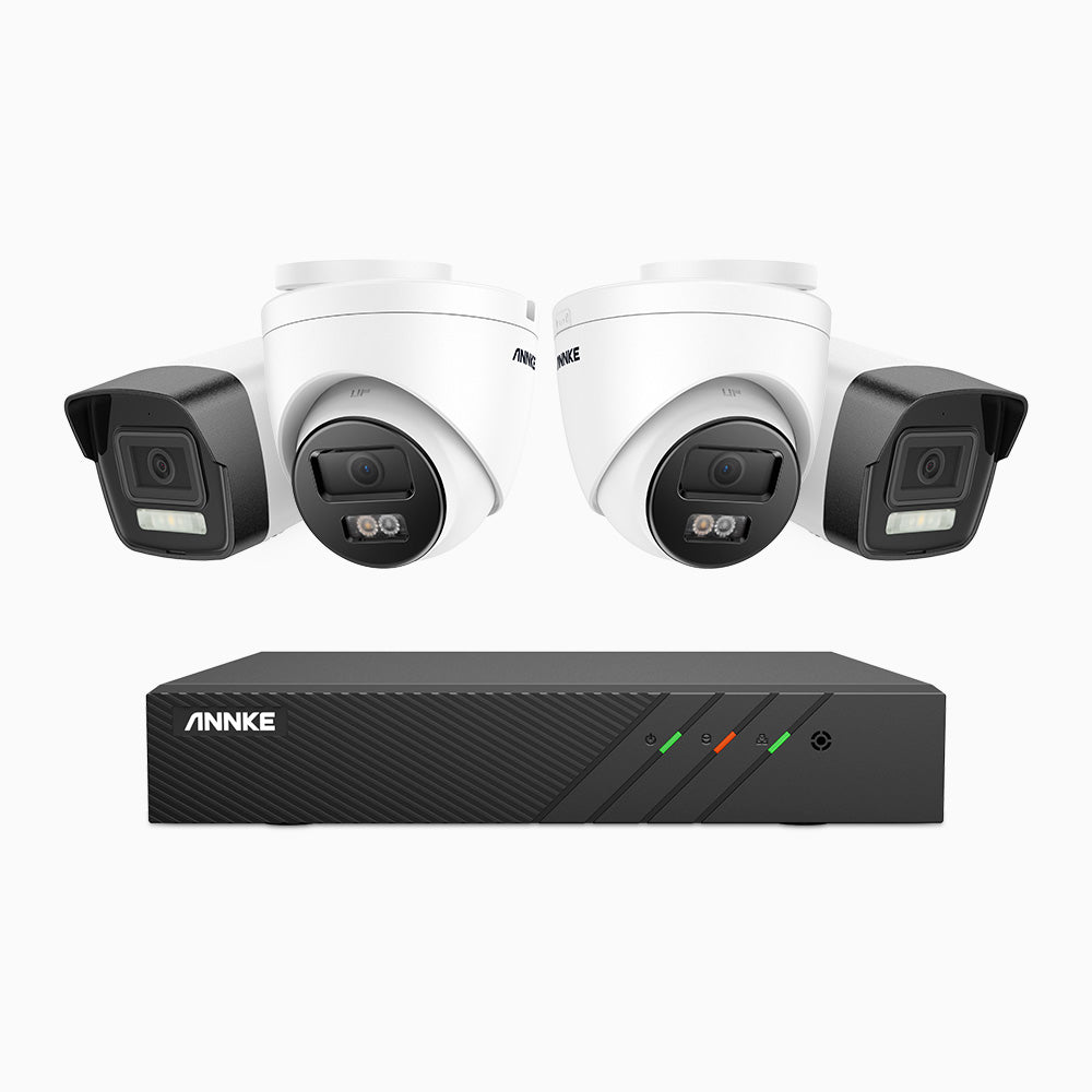 H500P - Kit de surveillance PoE 3K à 8 canaux avec 2 caméras bullet et 2 caméras tourelle, vision nocturne en couleur et infrarouge, résolution 3072*1728, ouverture f/1.6 (0.005 Lux), détection humaine et véhicule, microphone intégré, IP67