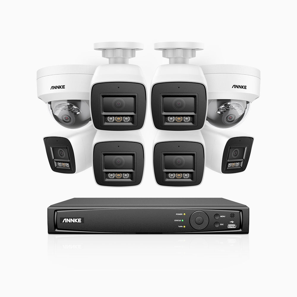 H800 - Kit de surveillance PoE 4K à 16 canaux avec 6 caméras bullet et 2 caméras dôme, anti-vandalisme IK10, vision nocturne en couleur et infrarouge, Détection Personne-Véhicule, Microphone intégré, Champ de vision de 96°, RTSP et ONVIF pris en charge