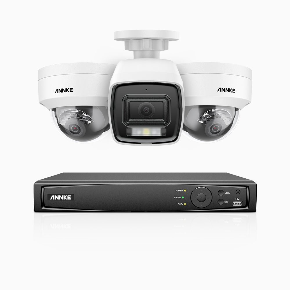 H800 - Kit de surveillance PoE 4K à 4 canaux avec 1 caméra bullet et 2 caméras dôme, anti-vandalisme IK10, vision nocturne en couleur et infrarouge, Détection Personne-Véhicule, Microphone intégré, Champ de vision de 96°, RTSP et ONVIF pris en charge