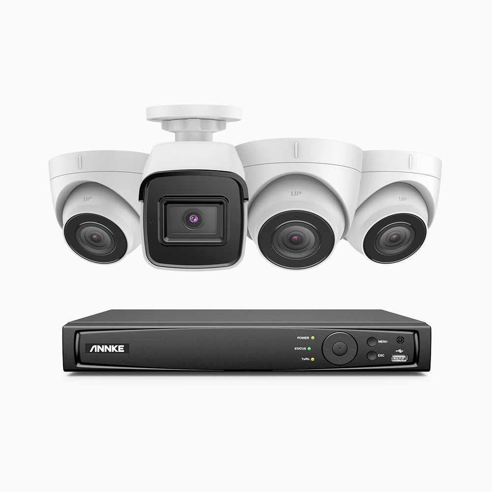 H800 - Kit de surveillance PoE 4K à 4 canaux avec 1 caméra bullet et 3 caméras tourelle, vision nocturne en couleur et infrarouge, Détection Personne-Véhicule, Microphone intégré, Champ de vision de 96°, RTSP et ONVIF pris en charge