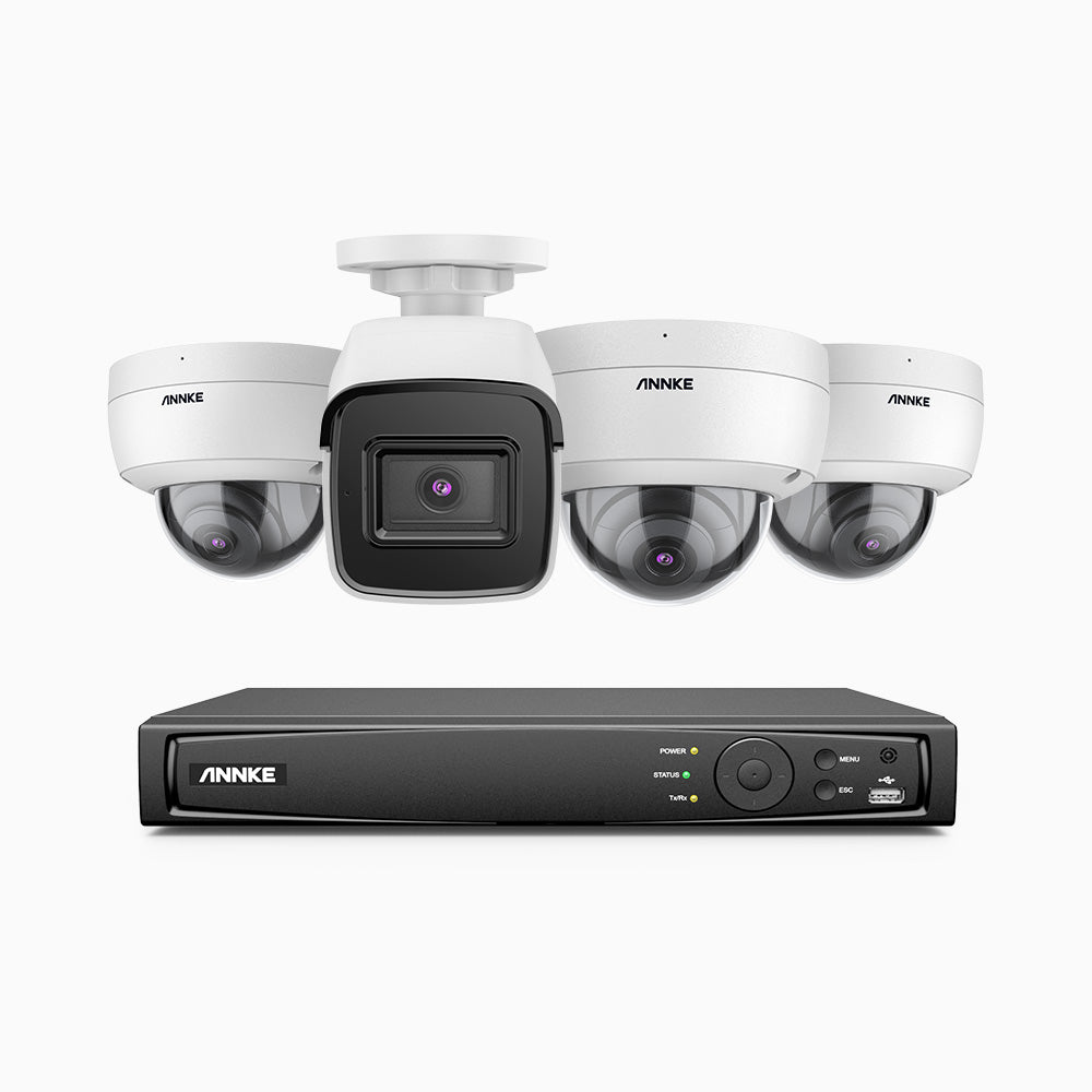 H800 - Kit de surveillance PoE 4K à 8 canaux avec 1 caméra bullet et 3 caméras dôme, anti-vandalisme IK10, vision nocturne en couleur et infrarouge, Détection Personne-Véhicule,Microphone intégré, Champ de vision de 96°, RTSP et ONVIF pris en charge