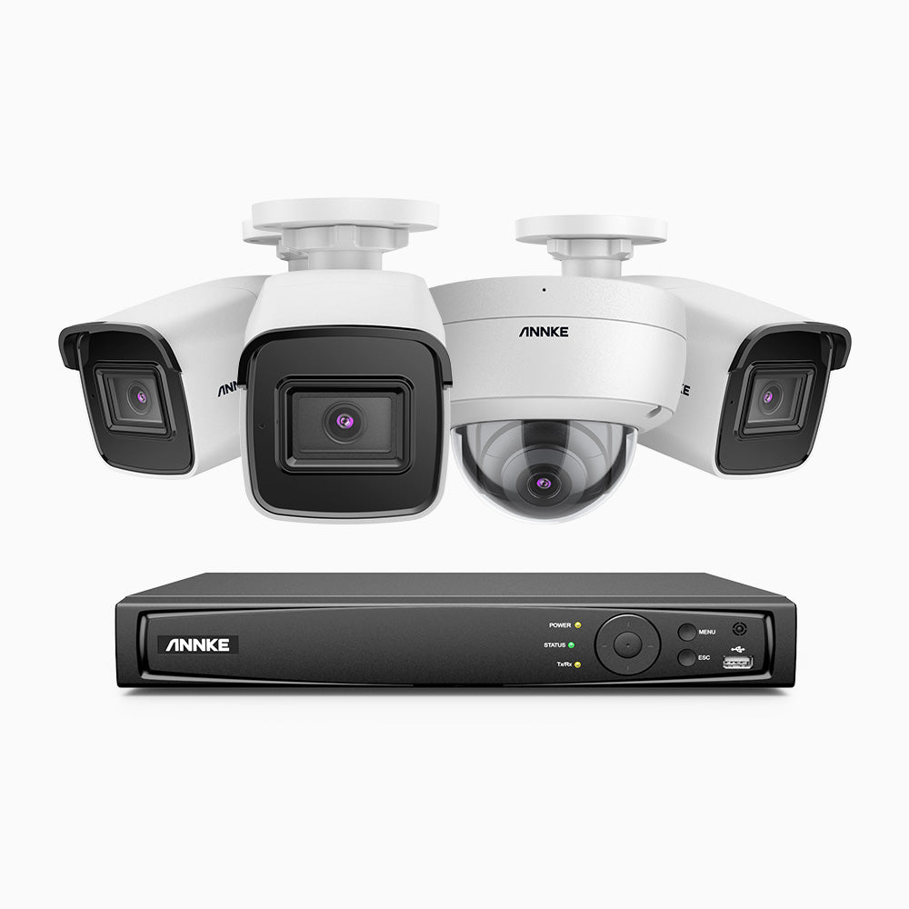 H800 - Kit de surveillance PoE 4K à 8 canaux avec 3 caméras bullet et 1 caméra dôme, anti-vandalisme IK10, vision nocturne en couleur et infrarouge, Détection Personne-Véhicule,Microphone intégré, Champ de vision de 96°, RTSP et ONVIF pris en charge