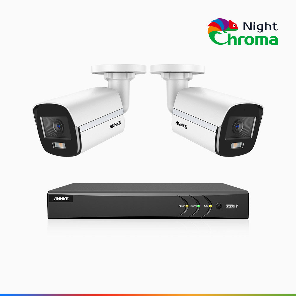 NightChromaTM NAK500 - Kit de sécurité extérieure TVI 3K à 8 canaux avec 2 caméras, vision nocturne couleur Acme, Résolution de 2960 × 1665, Ouverture f/1.0 (0,001 lux), Microphone intégré, IP67, Version améliorée