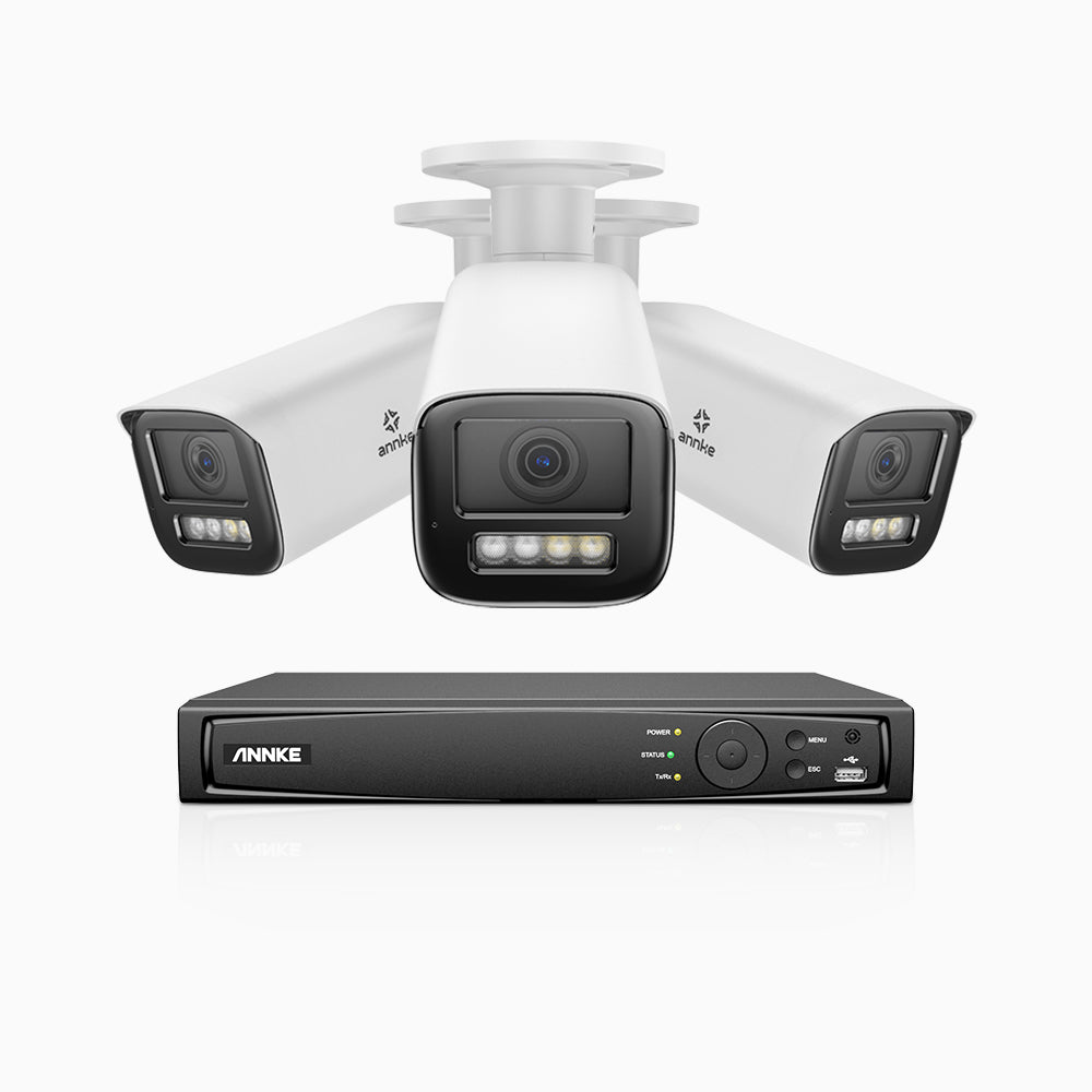 HZ804 - Kit de surveillance 4K à 4 canaux avec 3 PoE caméras, Zoom optique 4X, vision nocturne à deux lumières, détection de mouvement 2.0, Microphone intégré, sirène et alarme stroboscopique
