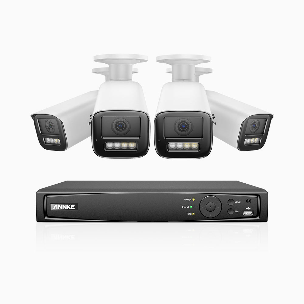 HZ804 - Kit de surveillance 4K à 4 canaux avec 4 PoE caméras, Zoom optique 4X, vision nocturne à deux lumières, détection de mouvement 2.0, Microphone intégré, sirène et alarme stroboscopique