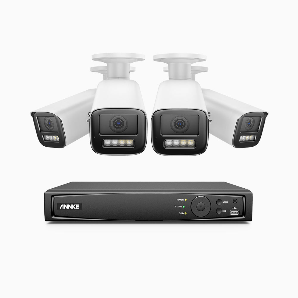 HZ804 - Kit de surveillance 4K à 8 canaux avec 4 PoE caméras, Zoom optique 4X, vision nocturne à deux lumières, détection de mouvement 2.0, Microphone intégré, sirène et alarme stroboscopique