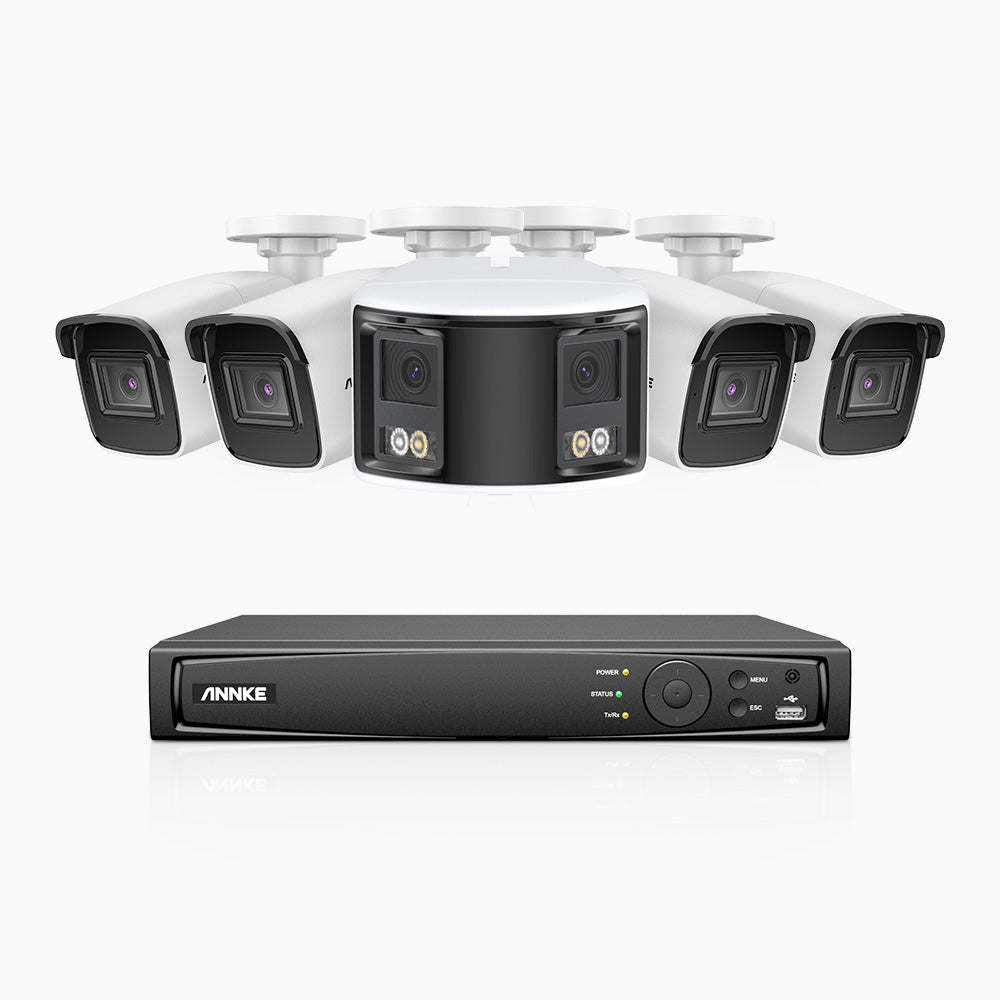 HDCK680 - Kit de surveillance PoE à 8 canaux avec 4*4K caméras et 1*6MP double objectif caméras (ultra grand angle 180°), Détection Personne-Véhicule, Microphone intégré
