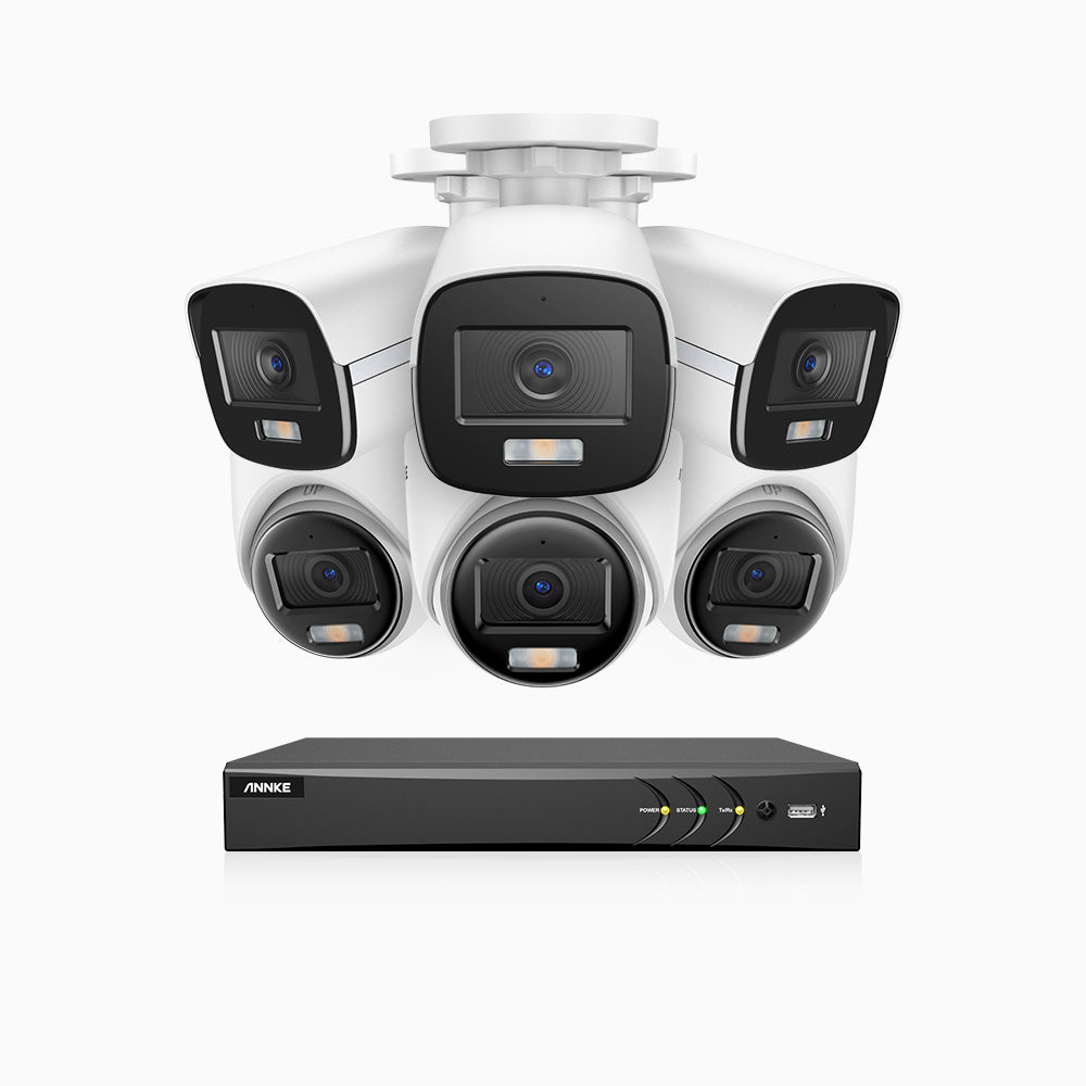 NightChromaTM NAK500 - Kit de sécurité extérieure TVI 3K à 8 canaux avec 3 caméras bullet et 3 caméras tourelle, vision nocturne couleur Acme, Résolution de 2960 × 1665, Ouverture f/1.0 (0,001 lux), Microphone intégré, IP67, Version améliorée