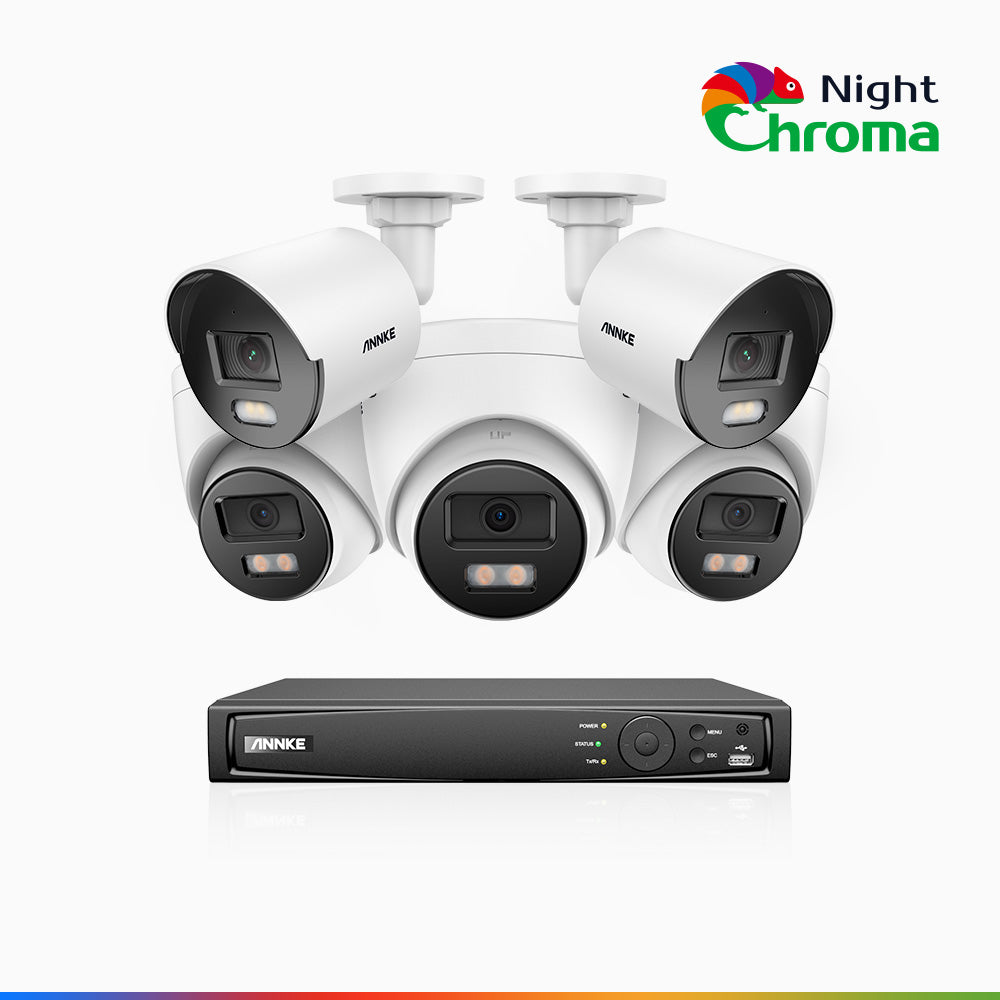 NightChromaTM NCK500 - Kit de surveillance PoE 3K à 8 canaux avec 2 caméras bullet et 3 caméras tourelle, vision nocturne polychrome, f/1.0 Super ouverture (0,001 Lux), Alignement actif, Microphone intégré, Fente pour carte SD