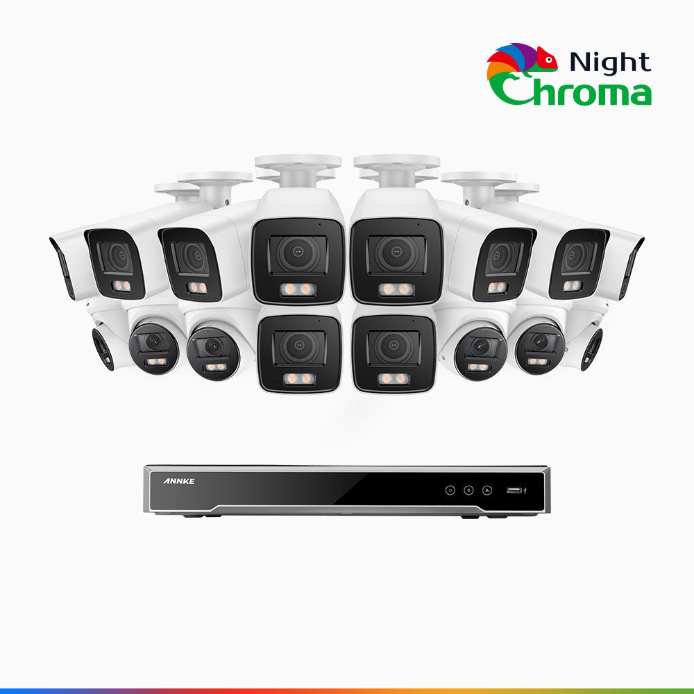 NightChromaTM NCK800 - Kit de surveillance PoE 4MP à 16 canaux avec 10 caméras bullet et 6 caméras tourelle, Vision nocturne couleur ultime, super ouverture f/1.0 (0,0005 Lux), Détection Personne-Véhicule, Analyse comportementale intelligente