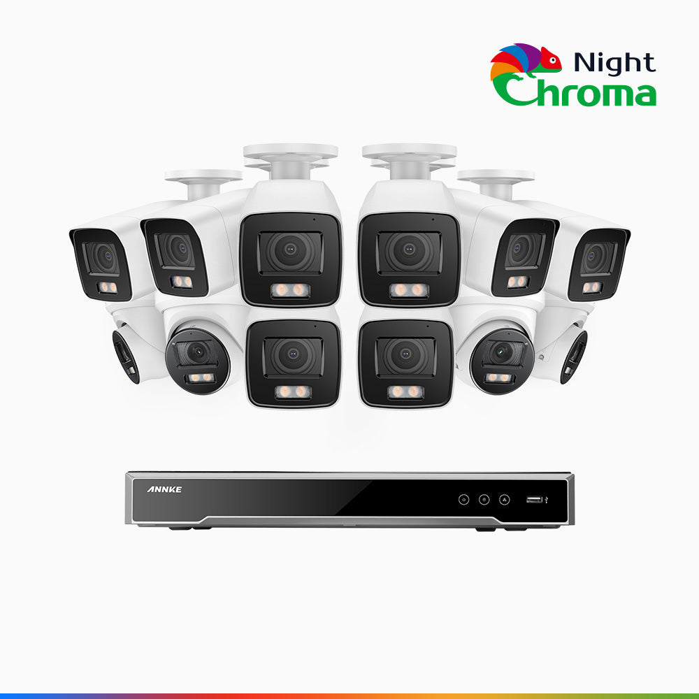 NightChromaTM NCK800 - Kit de surveillance PoE 4MP à 16 canaux avec 8 caméras bullet et 4 caméras tourelle, Vision nocturne couleur ultime, super ouverture f/1.0 (0,0005 Lux), Détection Personne-Véhicule, Analyse comportementale intelligente